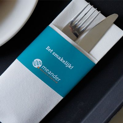 Het Meander Medisch Centrum geeft haar (patiënten-) maaltijden extra glans met de Naperole. Deze Naperole Classic is een samenstelling van een wit, superzacht Airlaid servet in een 50-grams kwaliteit met daar omheen de, volledig gepersonaliseerde, wikkel in een "smaakvolle" blauw-groene kleur. In het ontwerp heeft Meander MC, in ieder geval, de welgemeende boodschap; "Eet smakelijk!" opgenomen. Wanneer men dan al niet "gewoon" thuis kan genieten is juist, dat moment, van een smakelijke maaltijd natuurlijk extra belangrijk voor een mens en dat realiseren ze zich, bij Meander Medisch Centrum, dus heel goed! Wij vinden het, dan ook zeker een grote eer om deze, gerenommeerde, Zorginstelling waar de patiënt elke dag weer kan rekenen op klantvriendelijke, deskundige en betrouwbare zorg, tot onze klantenkring te mogen rekenen.